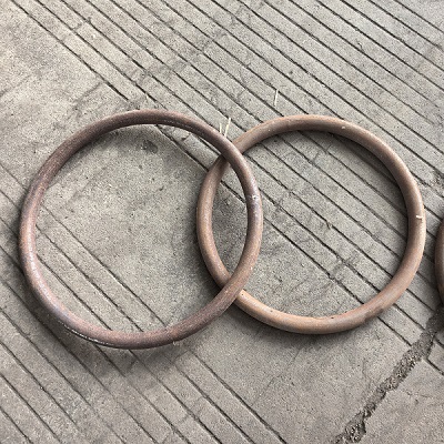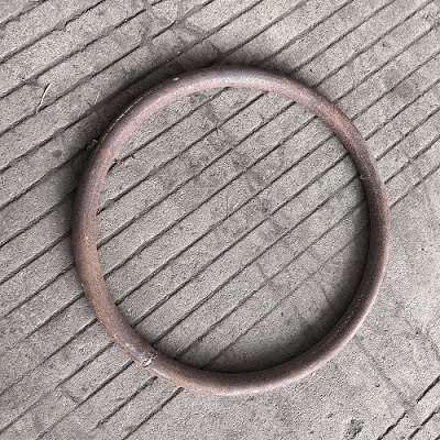 The device moves with two rows of semi-arc round wheels relative to each other, pressing the round tube to move forward, and using the adjustable guide wheel, the round tube forms a ring with a certain diameter. Finally, using cutting equipment, the rolled side-by-side rings are cut into individual rings. It is used as a handle for steel cylinders.