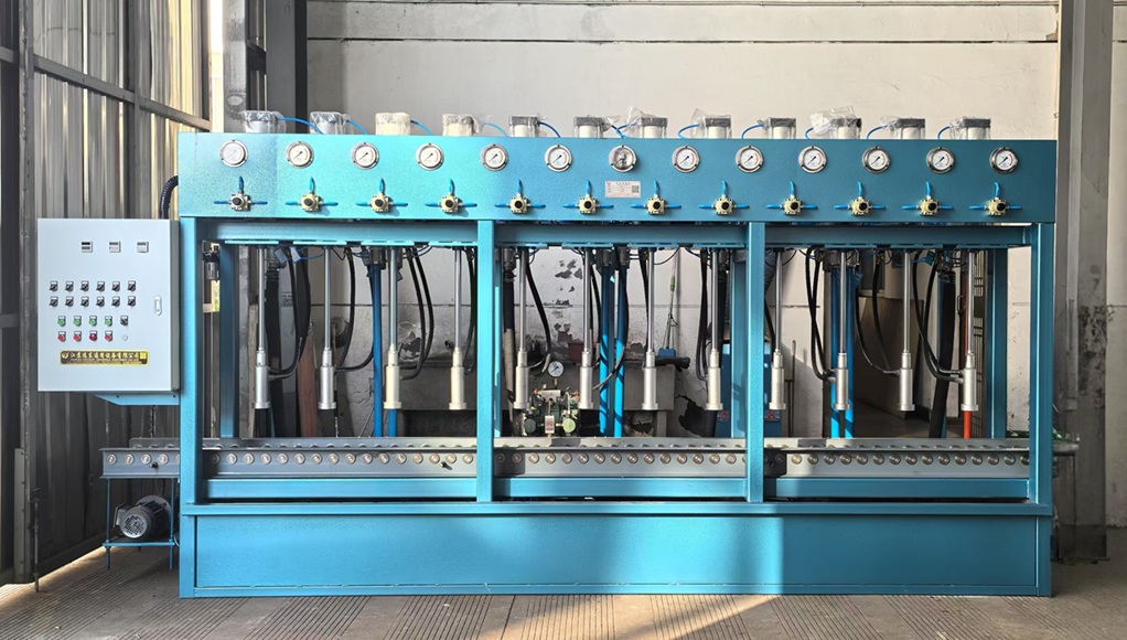 This equipment is a dedicated device for strength testing in the production of gas cylinders. It is composed of a frame, bottle feeding device, water filling, pressure holding and pressurization, drainage device, water tank, booster cylinder, centralized control cabinet electrical control and other parts. The workstations can be selected. This machine features a high degree of automation, is easy to operate, safe and reliable. It is an essential equipment for the production of gas cylinders. This machine is a through-type hydraulic testing machine (online), which is connected to the conveyor line for use. It integrates water addition, pressurization, pressure relief and drainage. Each workstation can be controlled independently. Through automated water injection pressurization and pressure holding tests, it ensures that the sealing performance and strength of the gas cylinders at the rated working pressure comply with national standards (such as GB/T 9251, ISO 10460, etc.), and is suitable for batch inspection of gas cylinders on the production line.