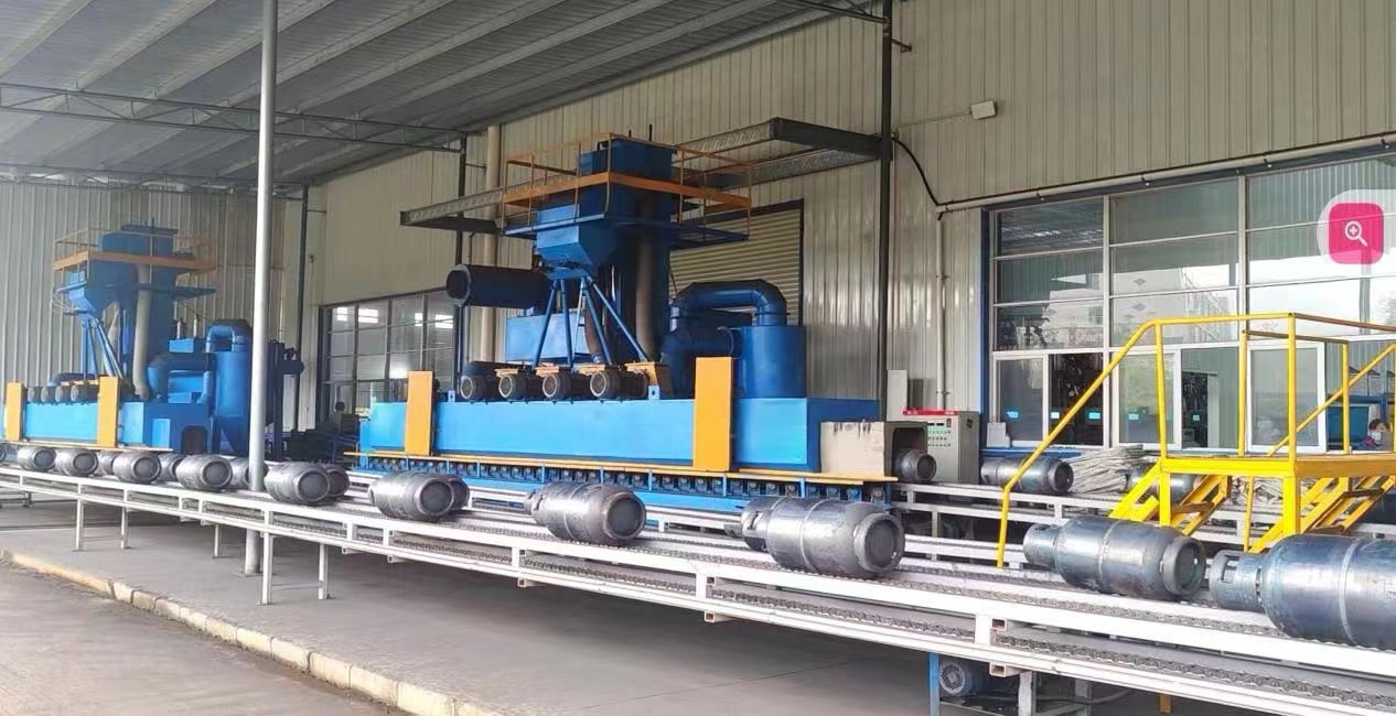 The liquefied petroleum gas cylinder shot blasting cleaning machine is an automated equipment specifically designed for the surface treatment of cylinders. It removes impurities such as oxide scale, welding slag, and rust on the outer wall of the cylinder through high-speed shot blasting, and at the same time forms a uniform roughness to enhance the adhesion of the subsequent sprayed coating. This equipment complies with the surface treatment standard of “GB/T 18851.4-2022” and is suitable for batch processing of various LPG cylinders (with specifications ranging from 3kg to 50kg).